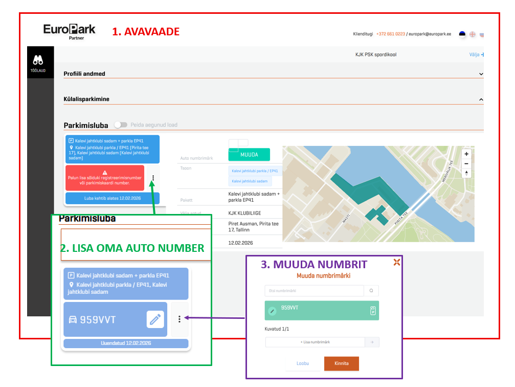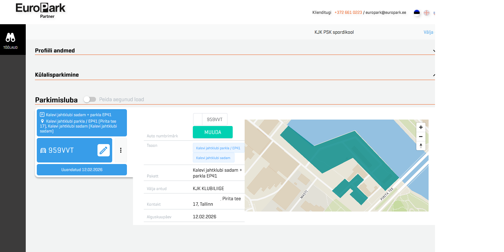Peale arve tasumist, saadame KJK liikme e-posti aadressile EuroPark Partner keskkonna kasutajalingi ning väljastatud parkimisluba saab hallata (s.h. vahetada auto numbrit) parkimisportaalis aadressiga https://partner.europark.ee.